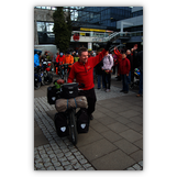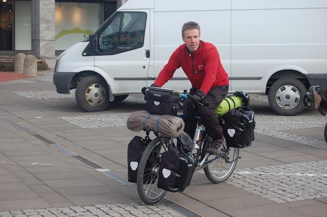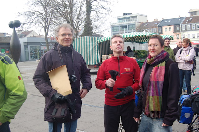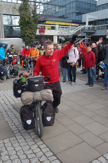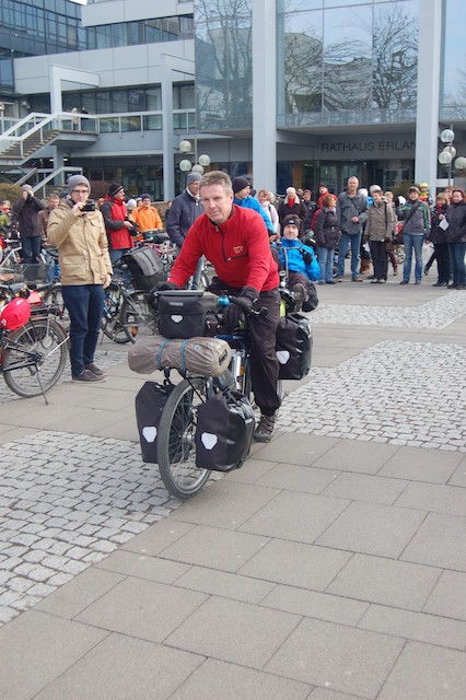 Aufbruch zur Weltumrundung am 28. März 2013 (Gründonnerstag) vor dem Erlanger Rathaus. Bürgermeisterin Dr. Elisabeth Preuß überreicht Peter Smolka die Grußschreiben für alle Erlanger Partnerstädte.